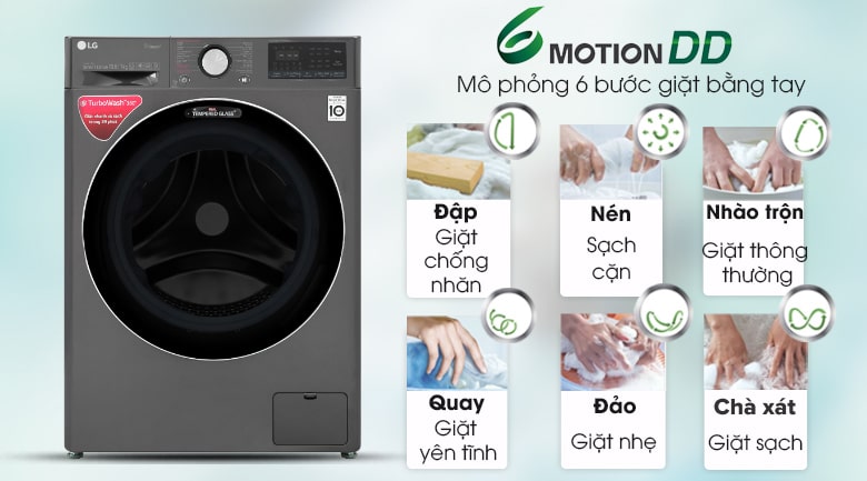 Ứng dụng công nghệ giặt 6 chuyển động mô phỏng theo 6 bước giặt bằng tay của con người, bạn có thể yên tâm hơn khi quần áo của gia đình mình được giặt sạch mạnh mẽ nhưng đảm bảo không bị hư hỏng, sờn vải hay tưa chỉ.